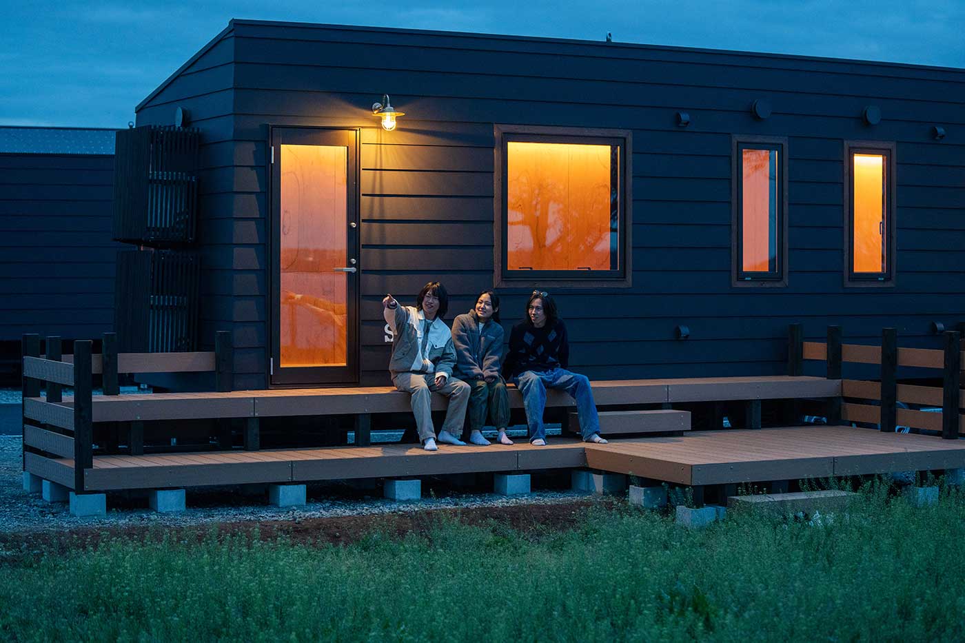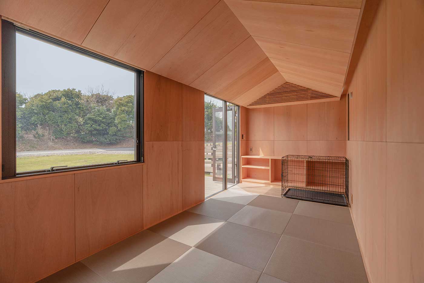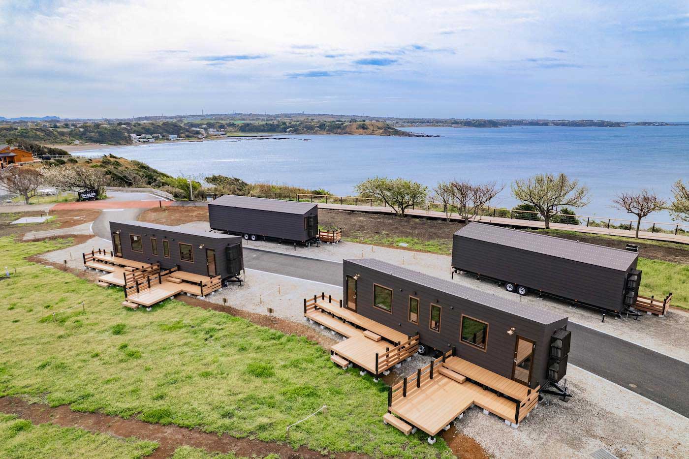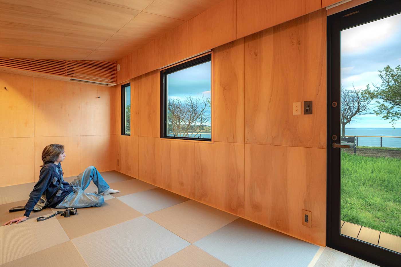 海のキャビンは水平ラインを基調としたアースカラーの外装に、内部はピクチャーウィンドウから海の水平線を見ることができる。