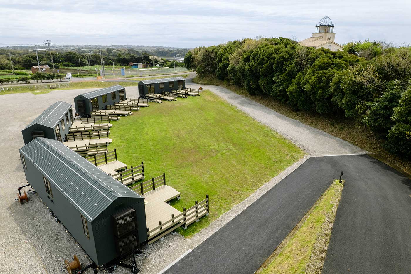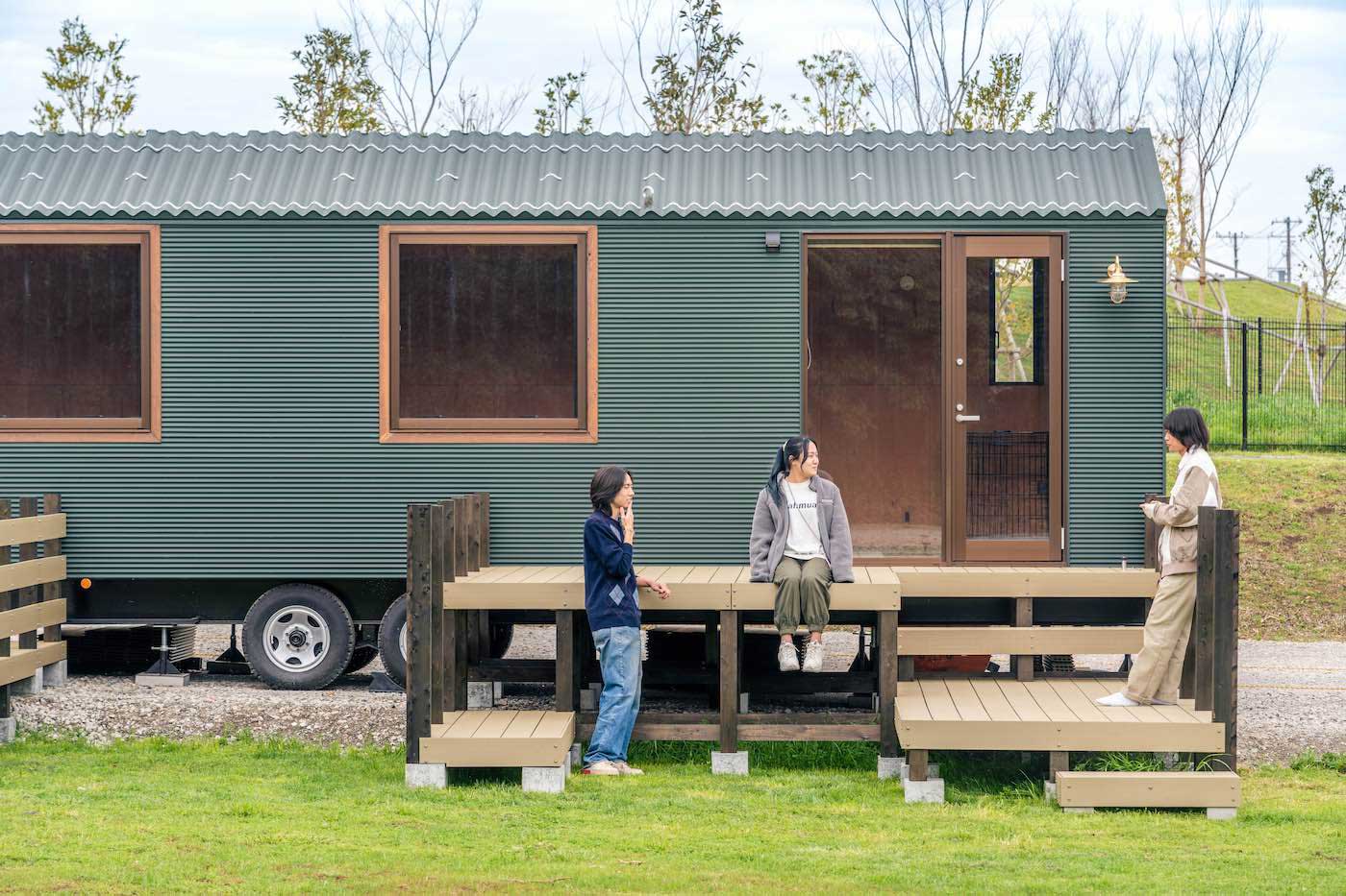 森のキャビンは全体のフィールドを円弧で囲うように配置。団体で一体感を持ち使用いただくことを想定している。また家形にしたフォルムから落ち着きと安心感を大切にした外装デザイン。