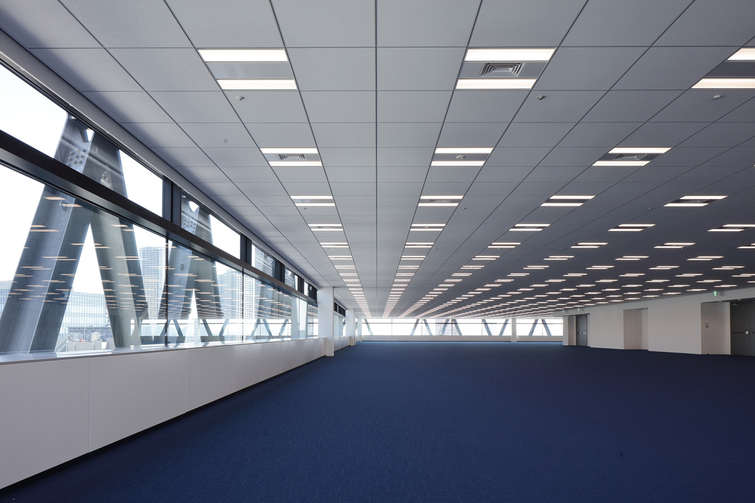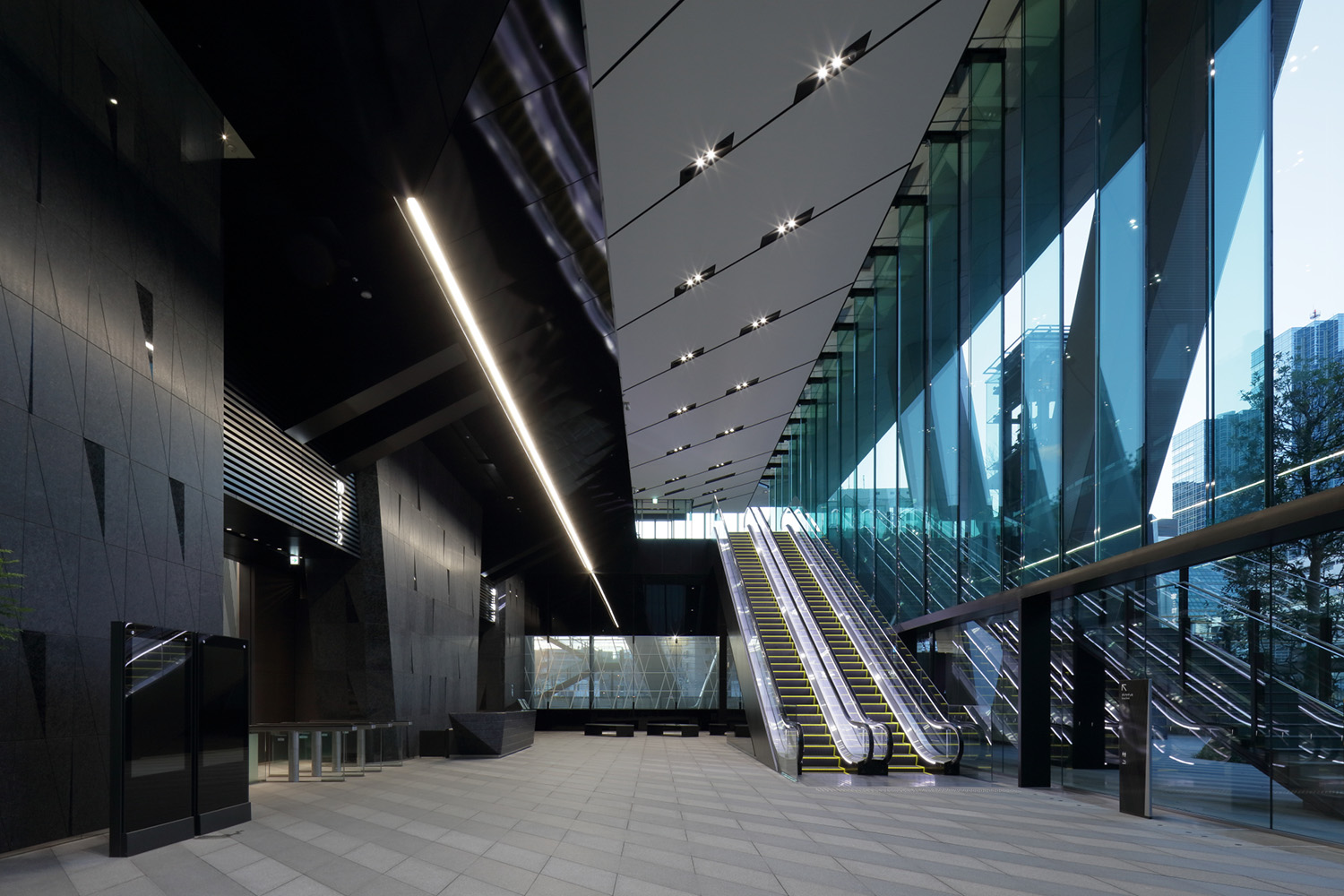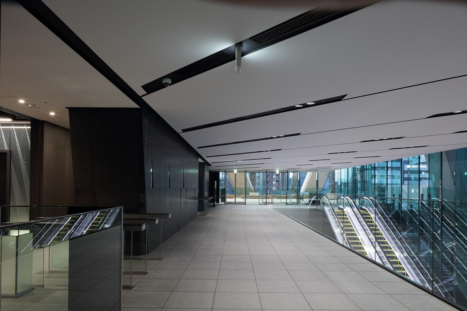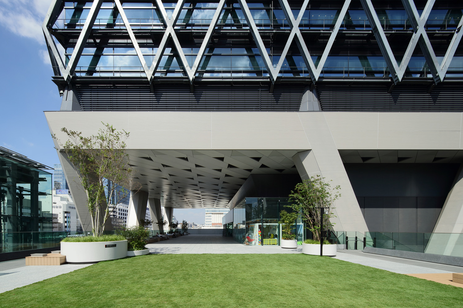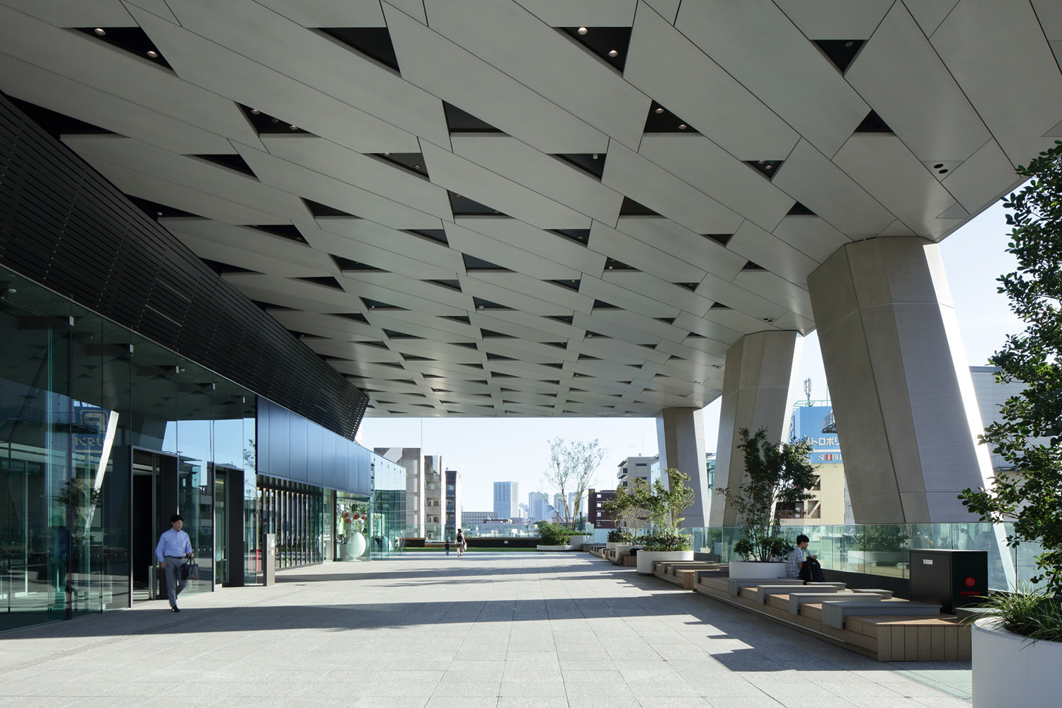 施設の最大化を目指し、鉄道をまたぐ建物を計画。鉄道会社の旧本社跡地という創業の地で、鉄道の時刻を正確に管理するダイアグラムをモチーフとした外装は、中間免振構造の特徴でもある、免振層上部の剛性を作る大切なフレームとなっている。同時に建物内の柱をミニマムにし、開放的なオフィス空間を実現した。また鉄道上部には公共の広場空間を計画し、鉄道により東西が分断されていた町をつなげる橋となると共に、地域の方々が24時間利用できる空中広場を設計した。