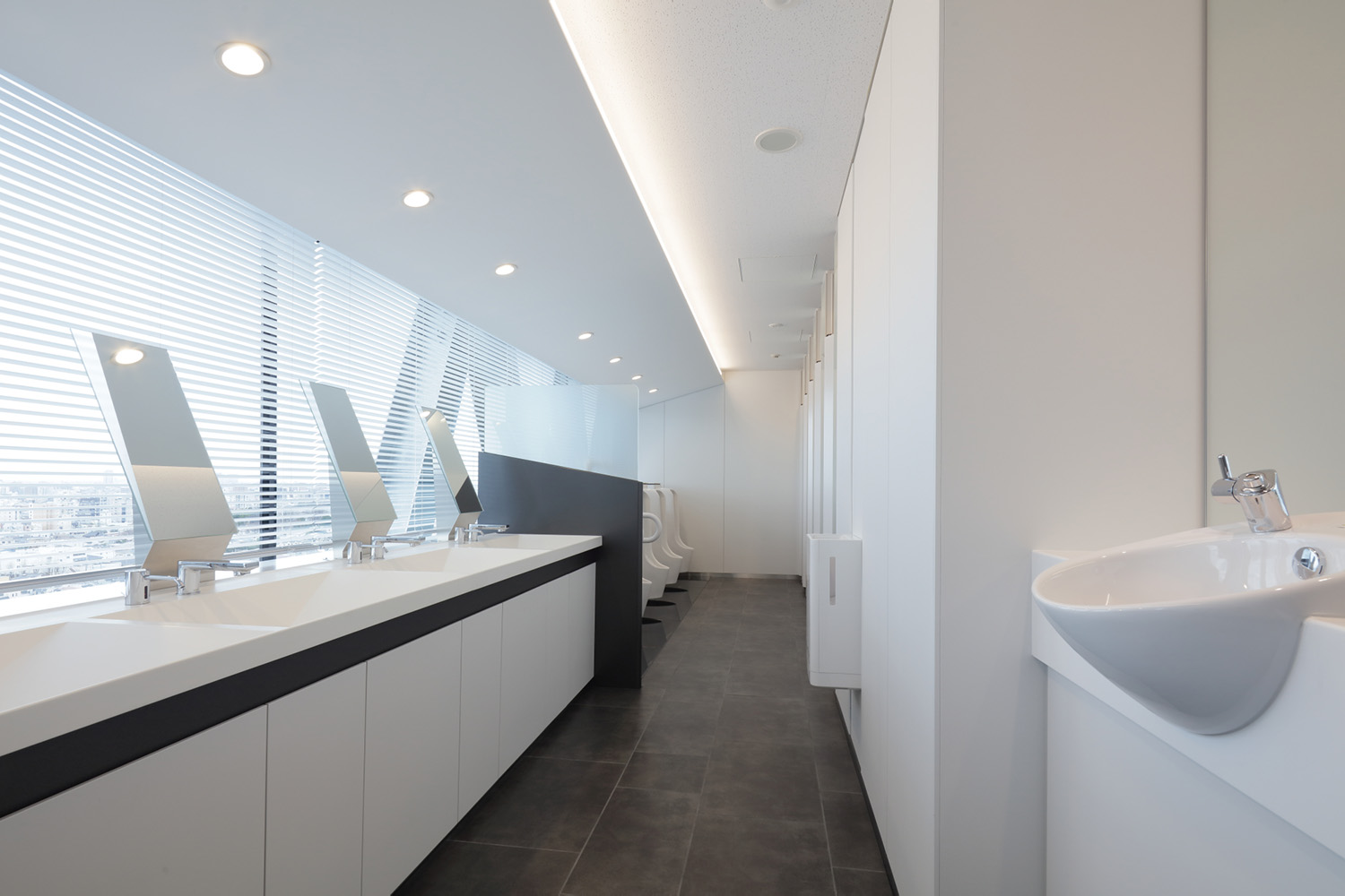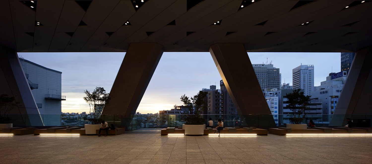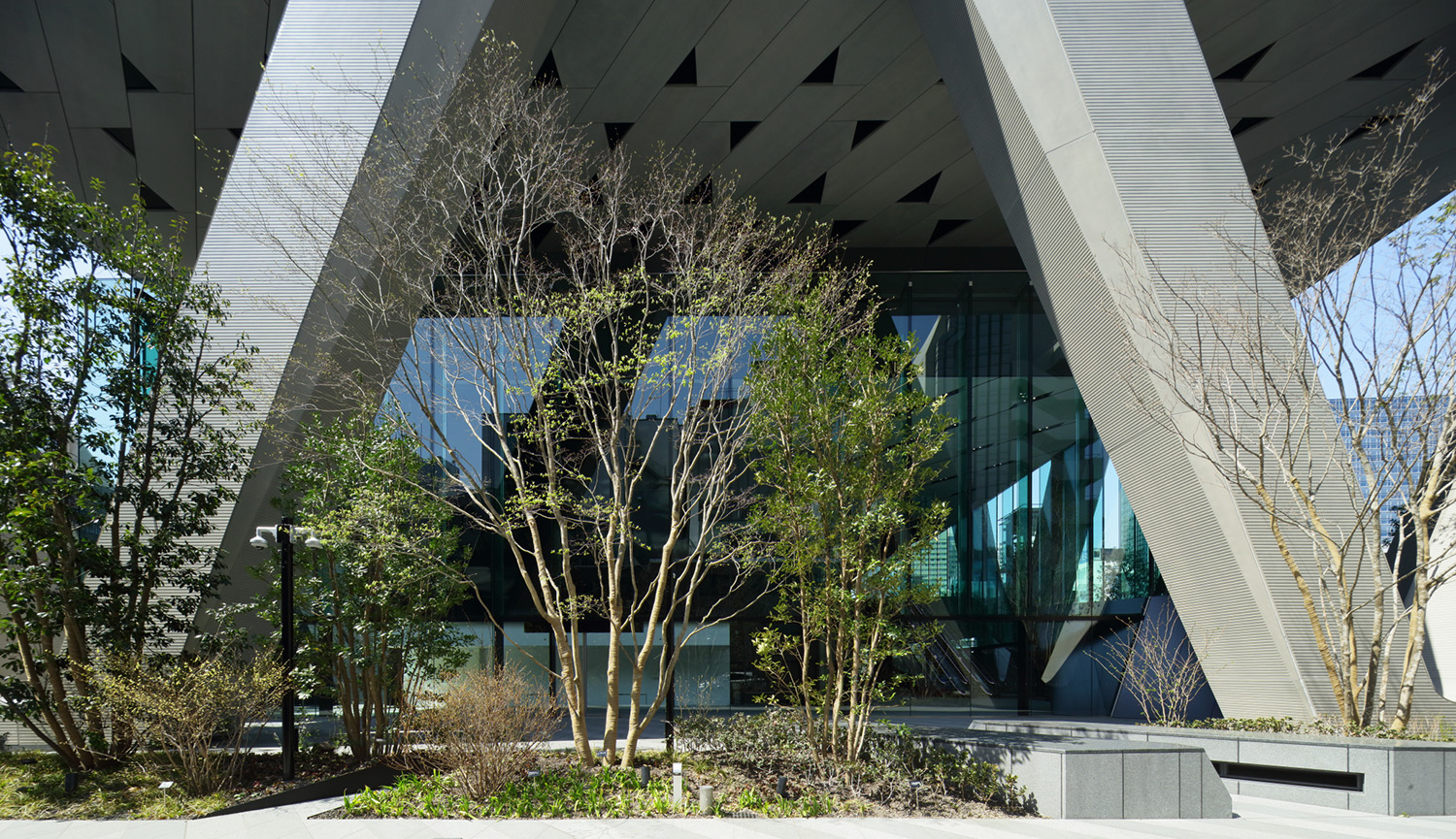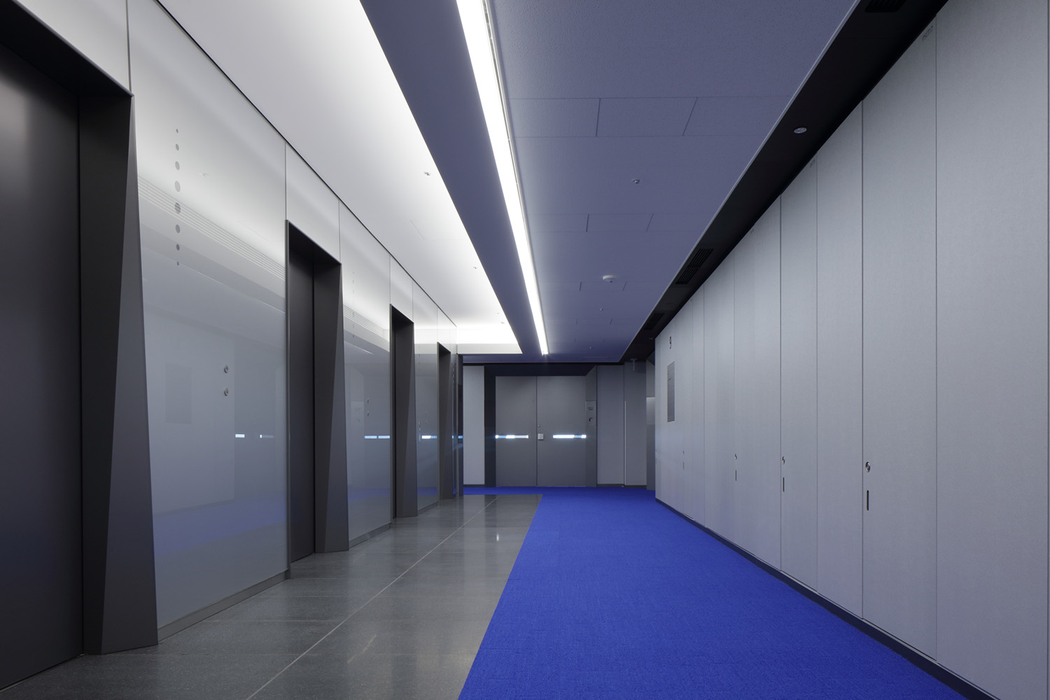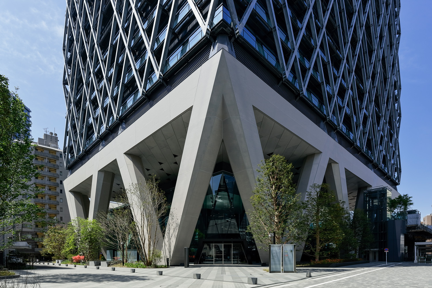 施設の最大化を目指し、鉄道をまたぐ建物を計画。鉄道会社の旧本社跡地という創業の地で、鉄道の時刻を正確に管理するダイアグラムをモチーフとした外装は、中間免振構造の特徴でもある、免振層上部の剛性を作る大切なフレームとなっている。同時に建物内の柱をミニマムにし、開放的なオフィス空間を実現した。また鉄道上部には公共の広場空間を計画し、鉄道により東西が分断されていた町をつなげる橋となると共に、地域の方々が24時間利用できる空中広場を設計した。