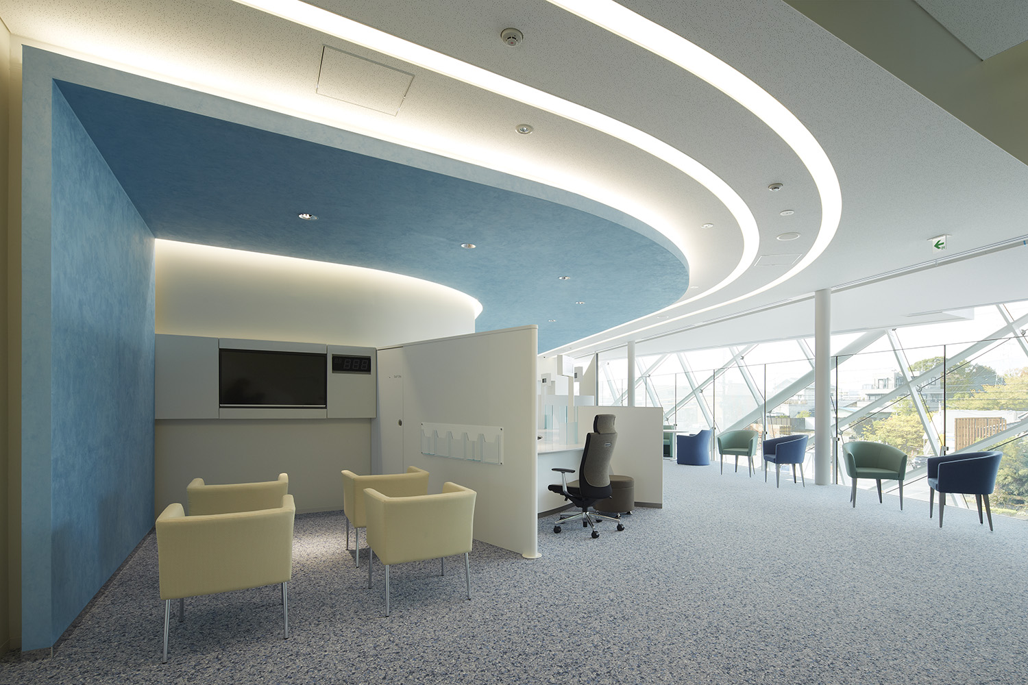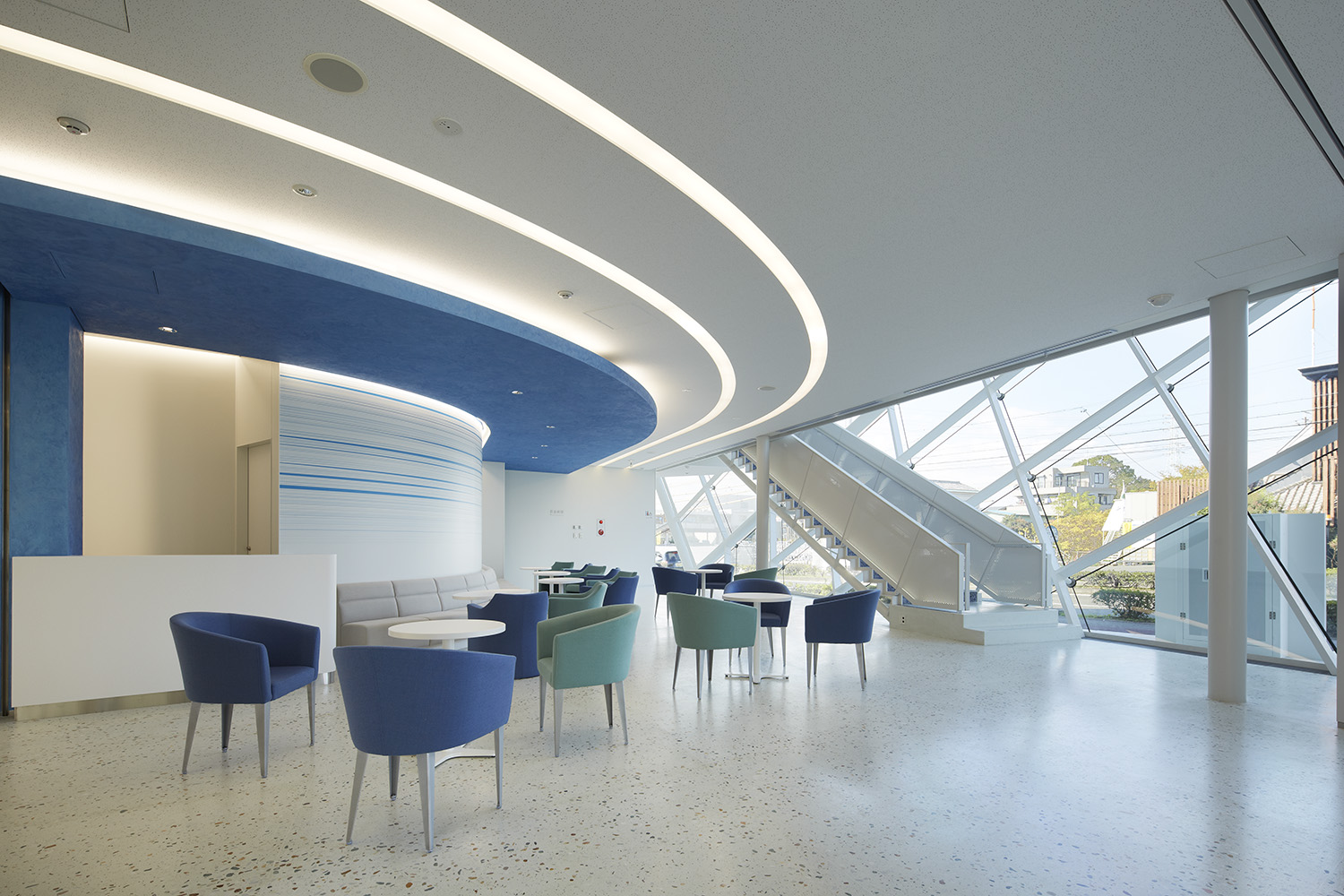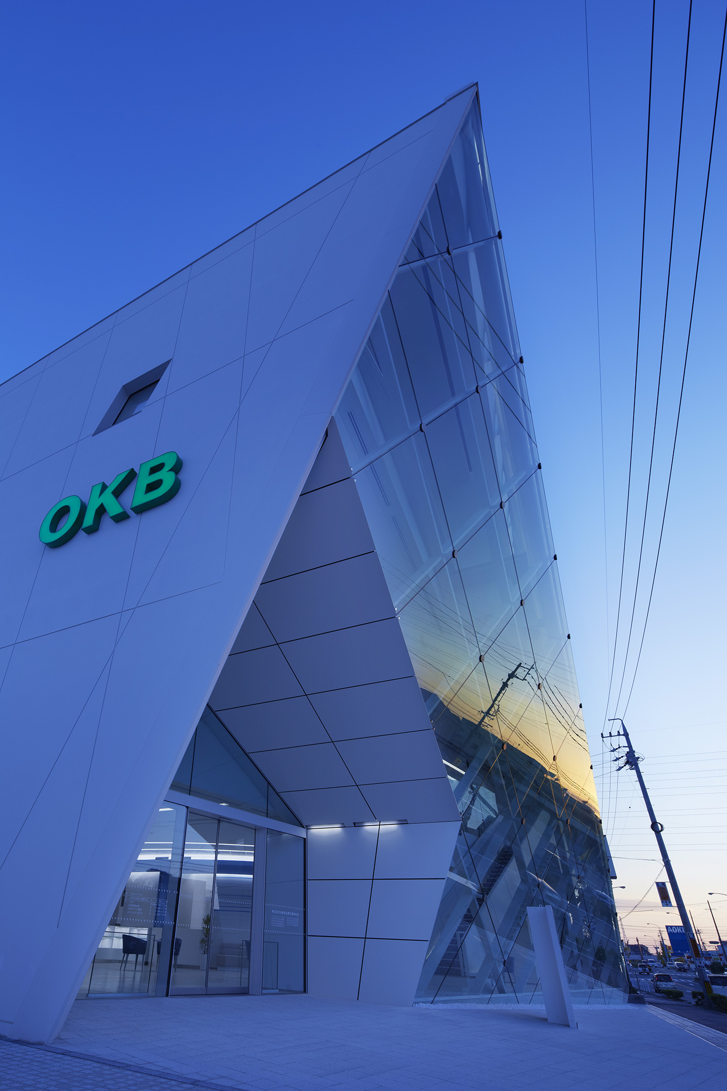 大垣共立銀行の東に進出するための基幹店として、車社会の町の中でも一目で認知してもらえることを第一として、昼夜問わず看板でなく建物のランドマーク性を大切にした外装デザインを行った。内装は風と水のまち豊橋をイメージした、青と流れをコンセプトにしたデザインとした。1Fにはカフェも併設することで、身近に立ち寄っていただけることを大切にしている。