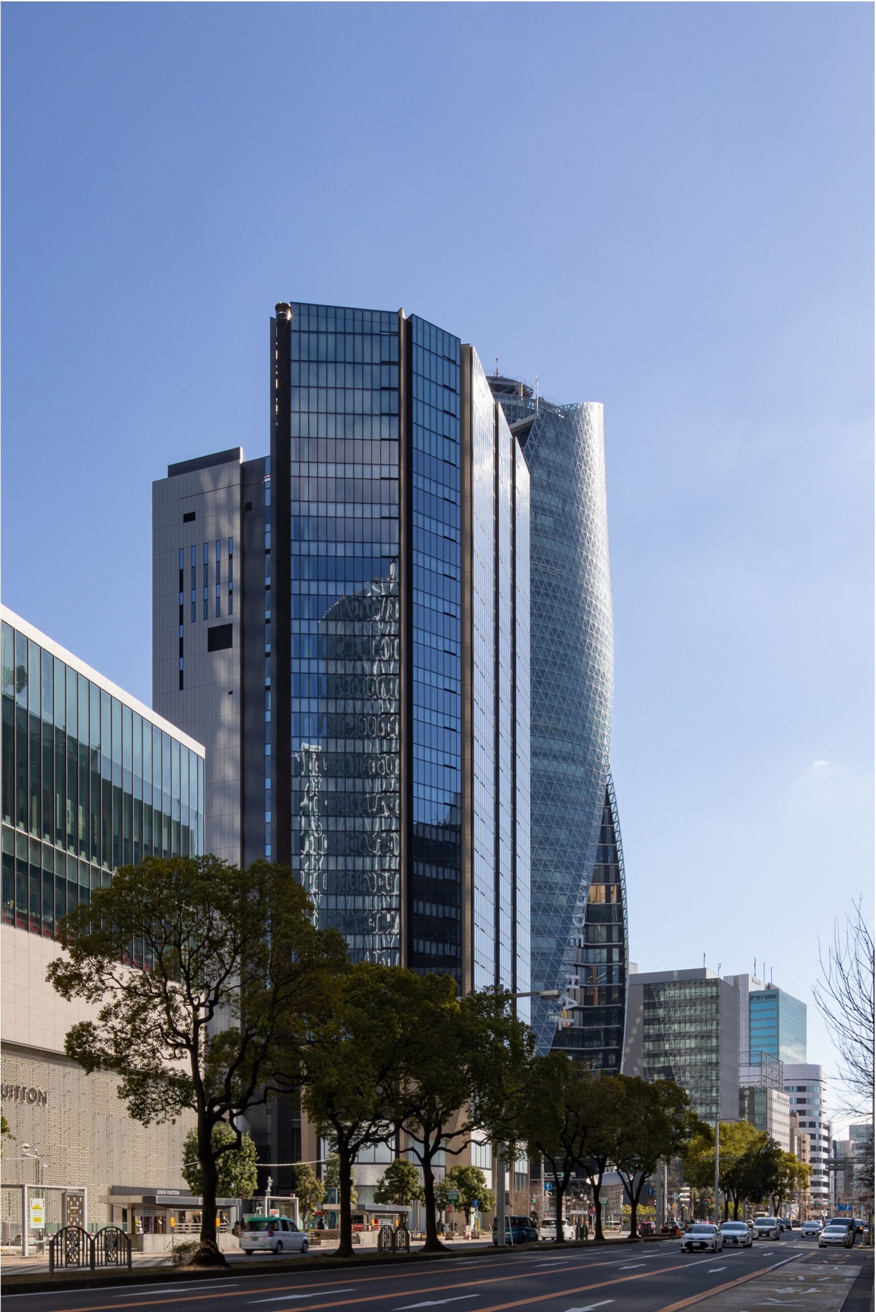 名古屋駅正面、二つの角地に面する敷地において、コーナー部を強調したデザインで外観を構成した複合ビル