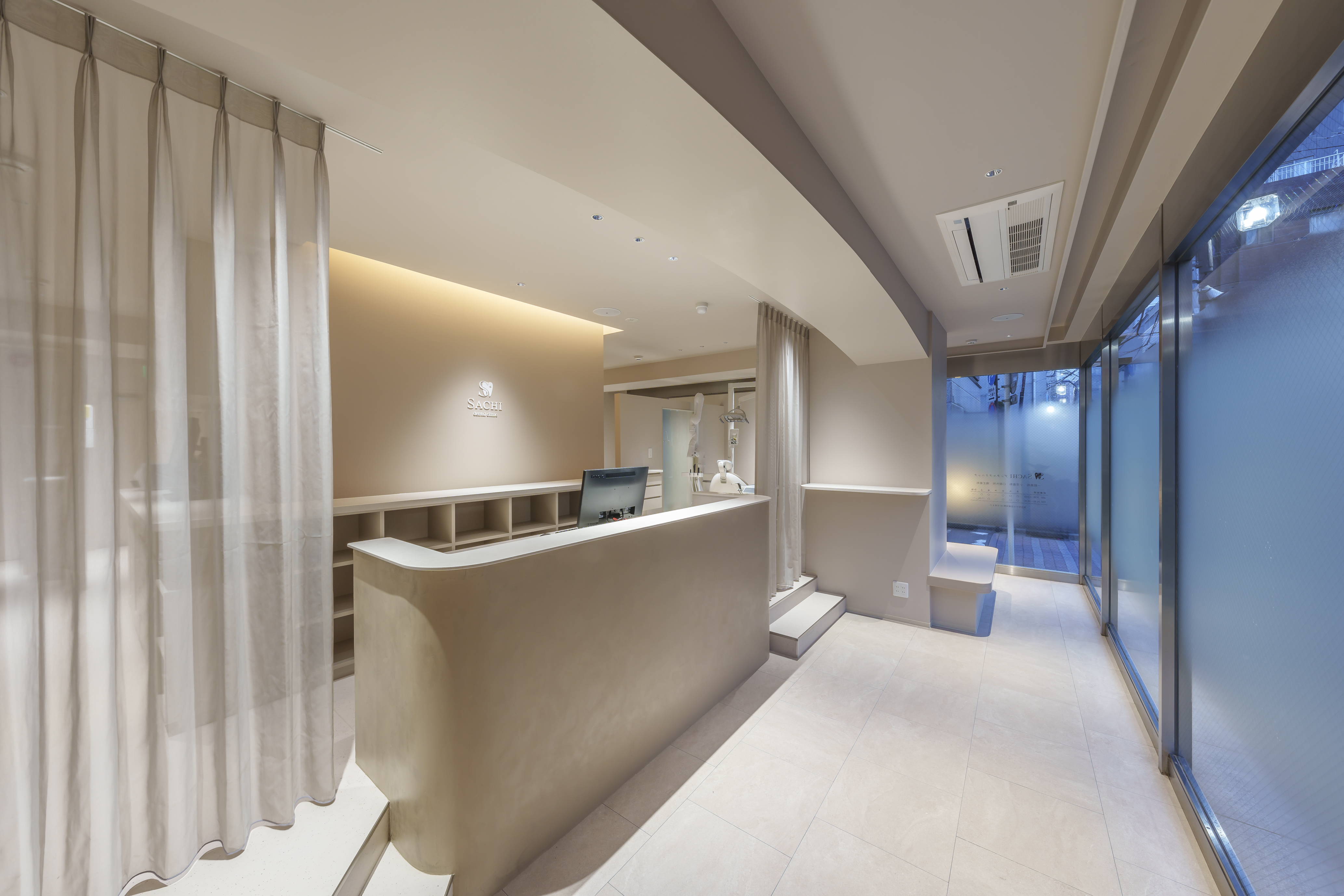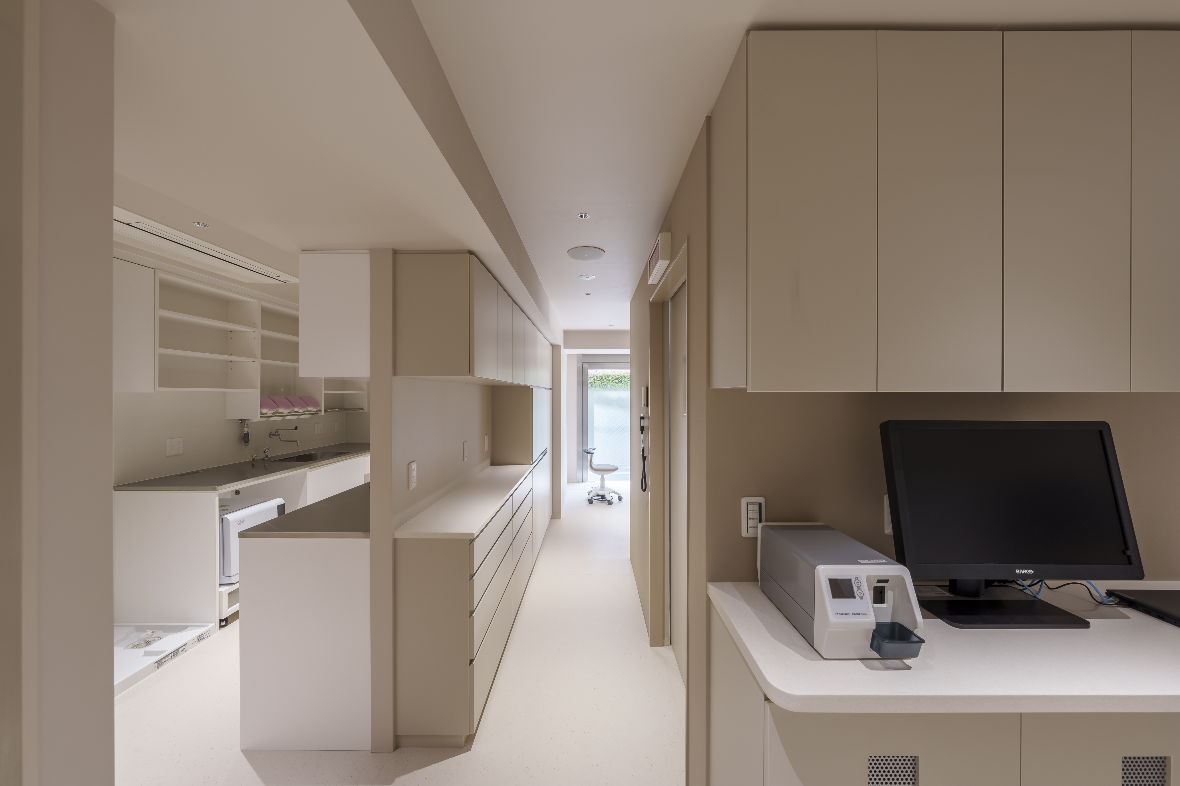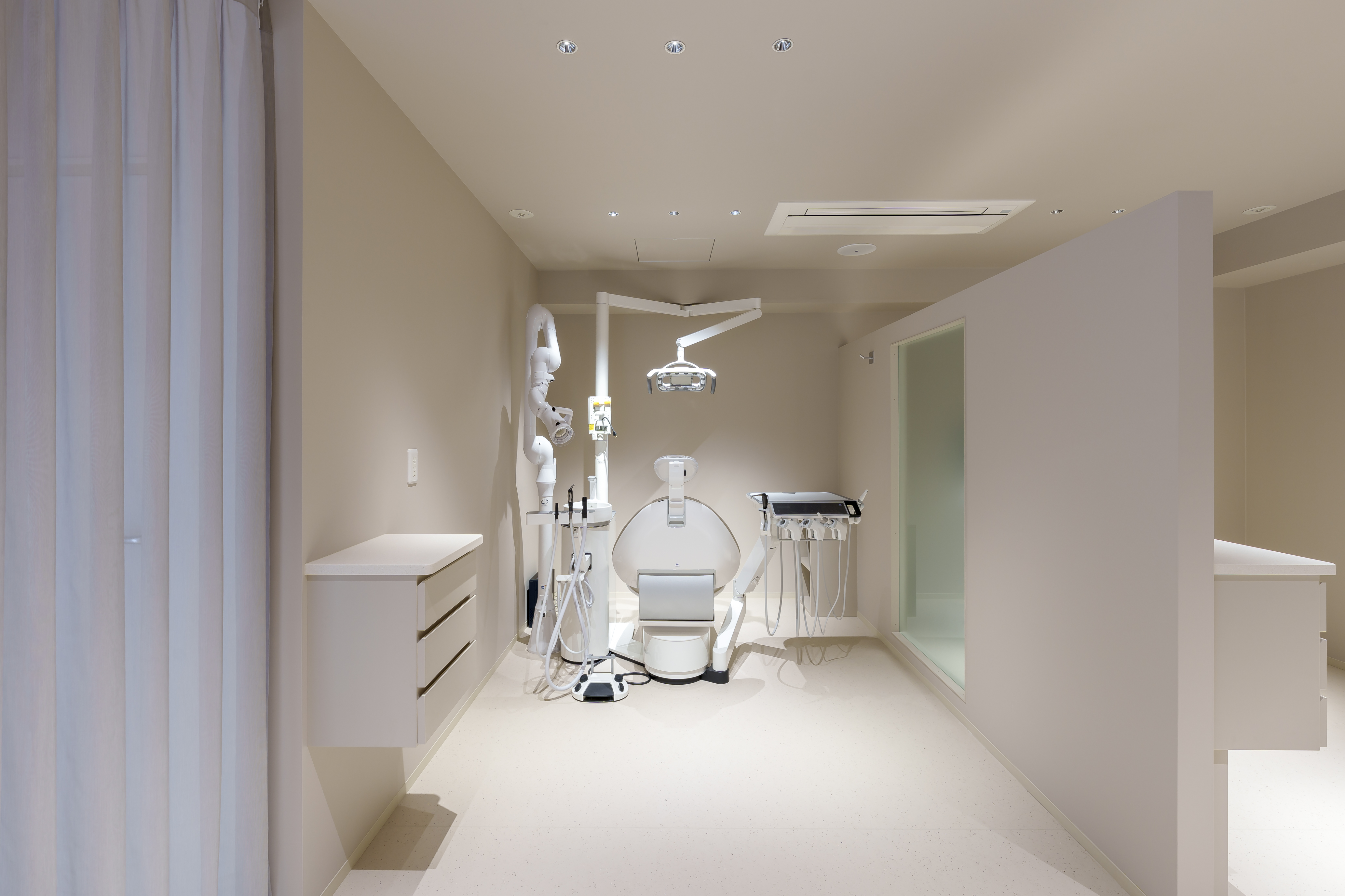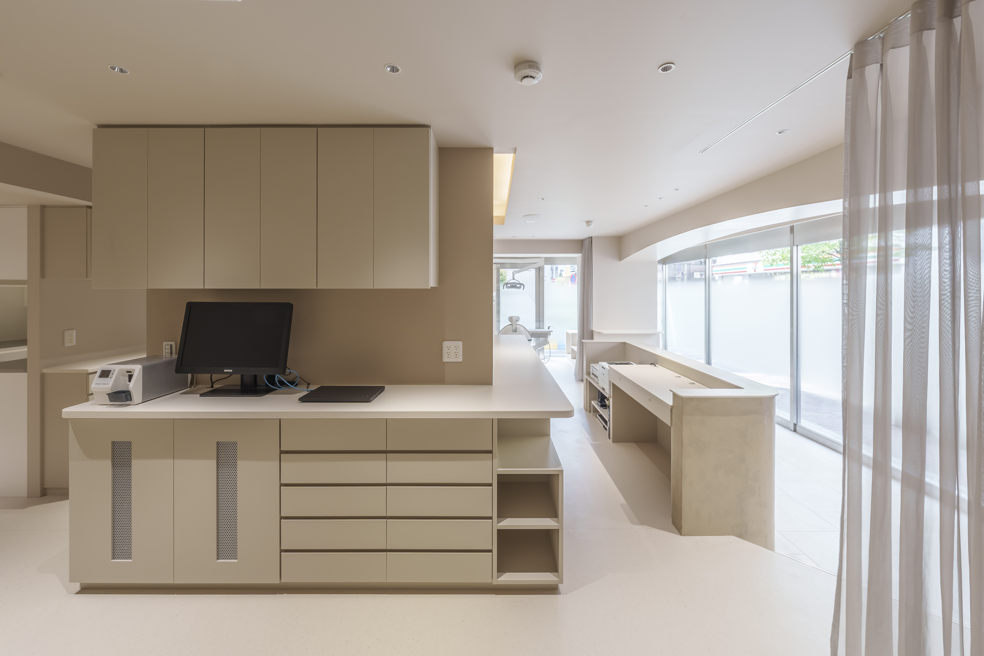 ご依頼をうけ、建築空間は可能な限りラインの少ない形状、採用色を限定することでノイズレスでスッキリとさせた空間を実現。ノイズレスな空間は清潔感、安心感がある背景になり、その中で生まれる治療、会話を主役となれるようデザインしている。