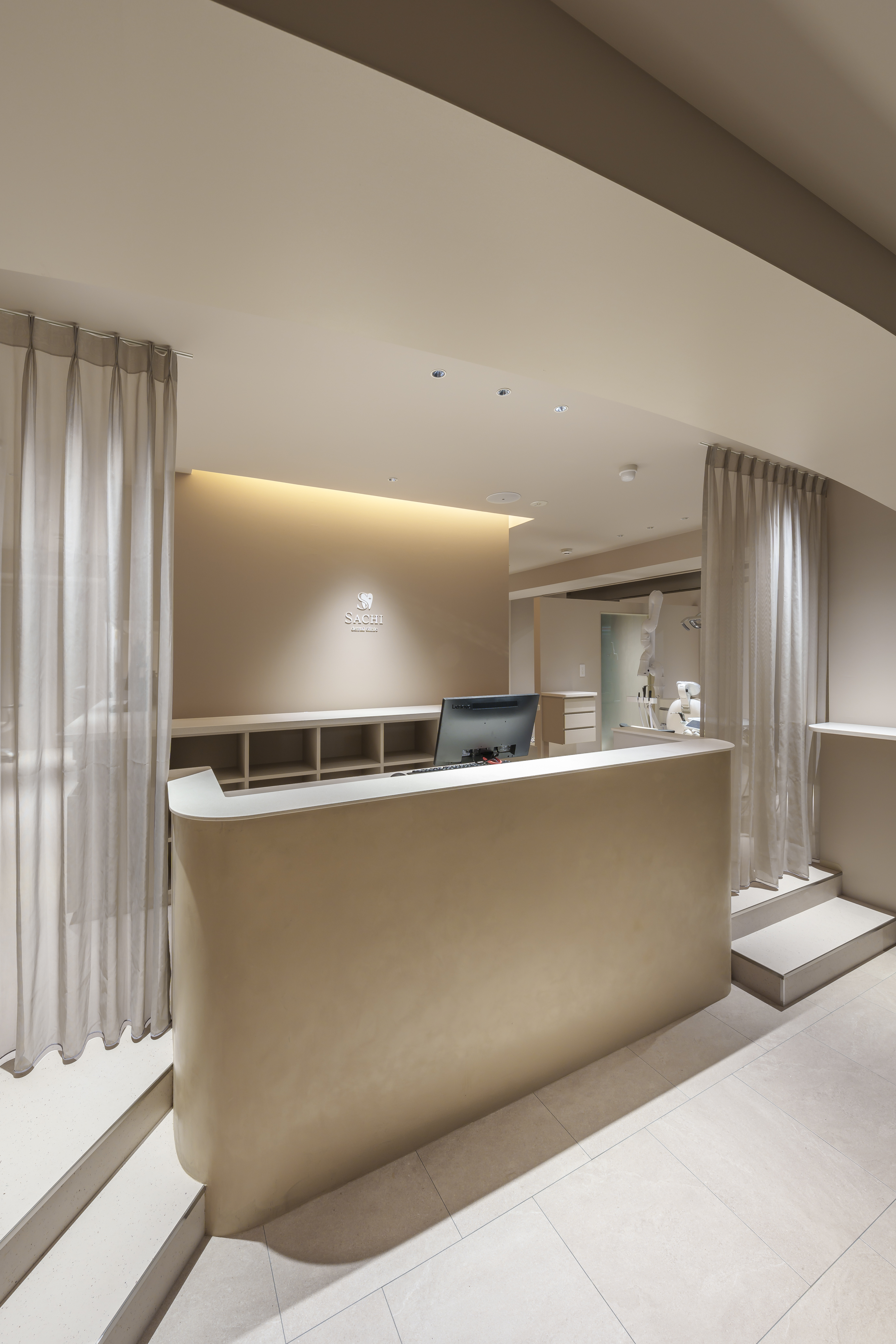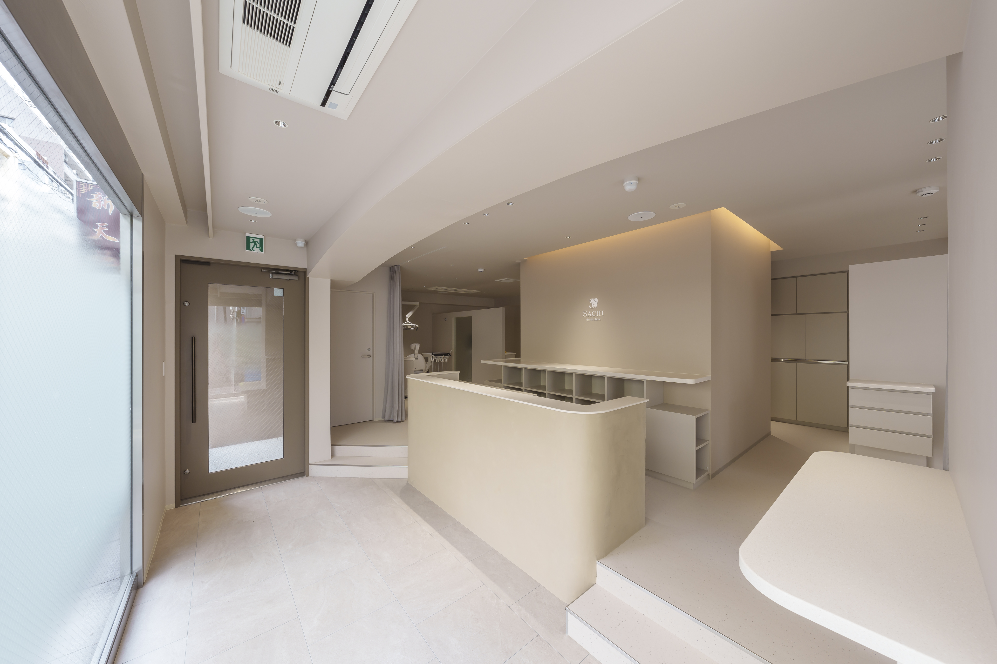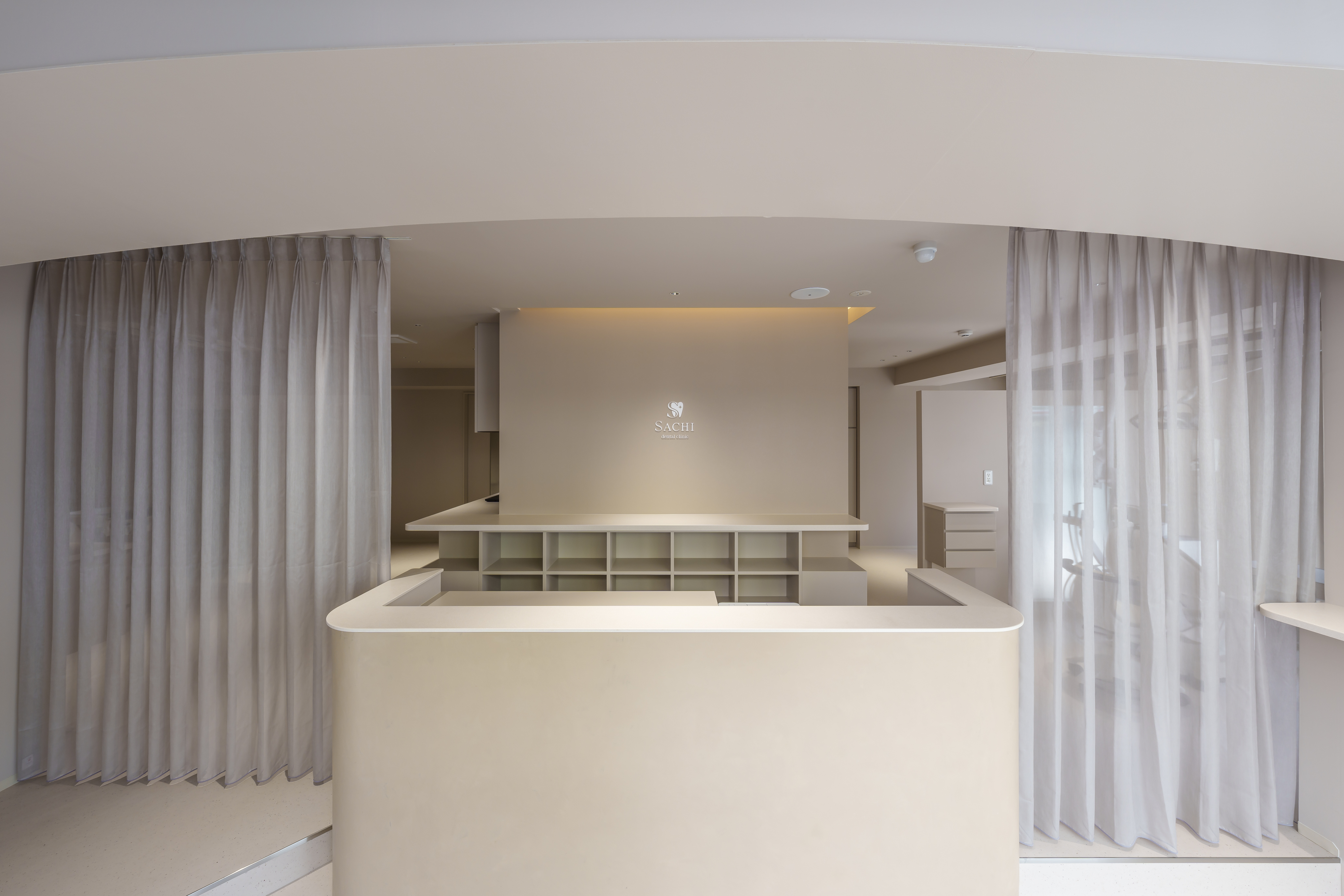 ご依頼をうけ、建築空間は可能な限りラインの少ない形状、採用色を限定することでノイズレスでスッキリとさせた空間を実現。ノイズレスな空間は清潔感、安心感がある背景になり、その中で生まれる治療、会話を主役となれるようデザインしている。