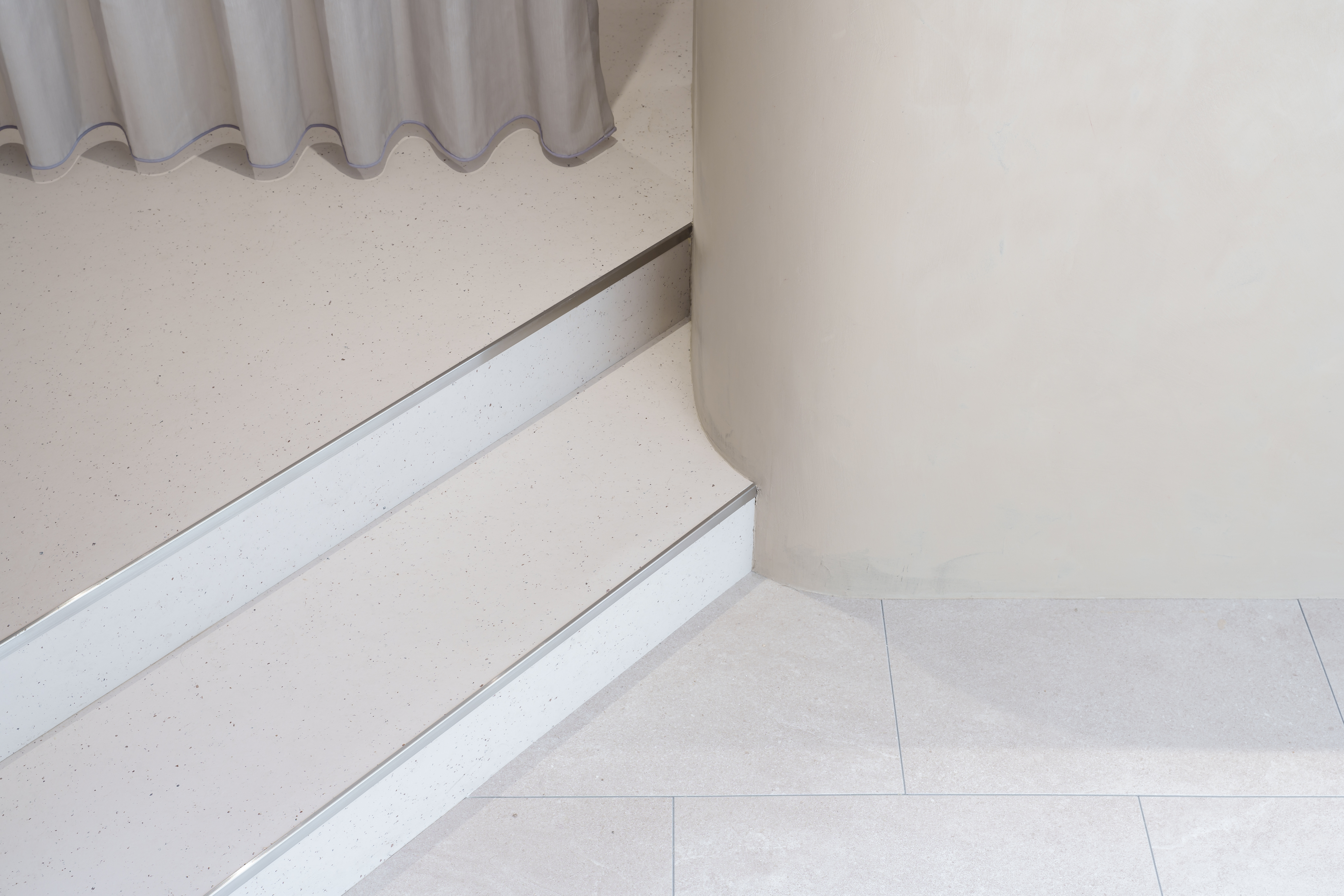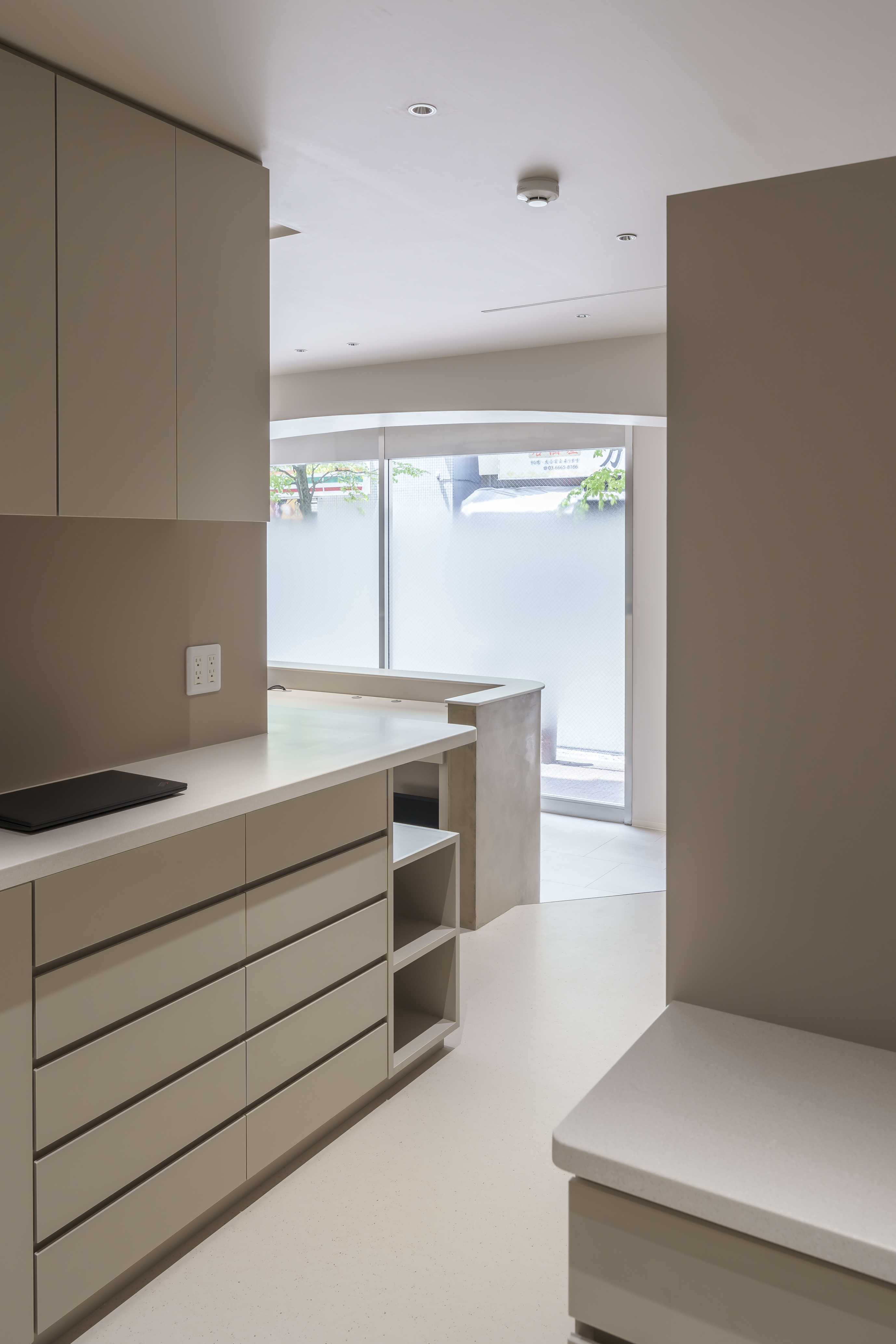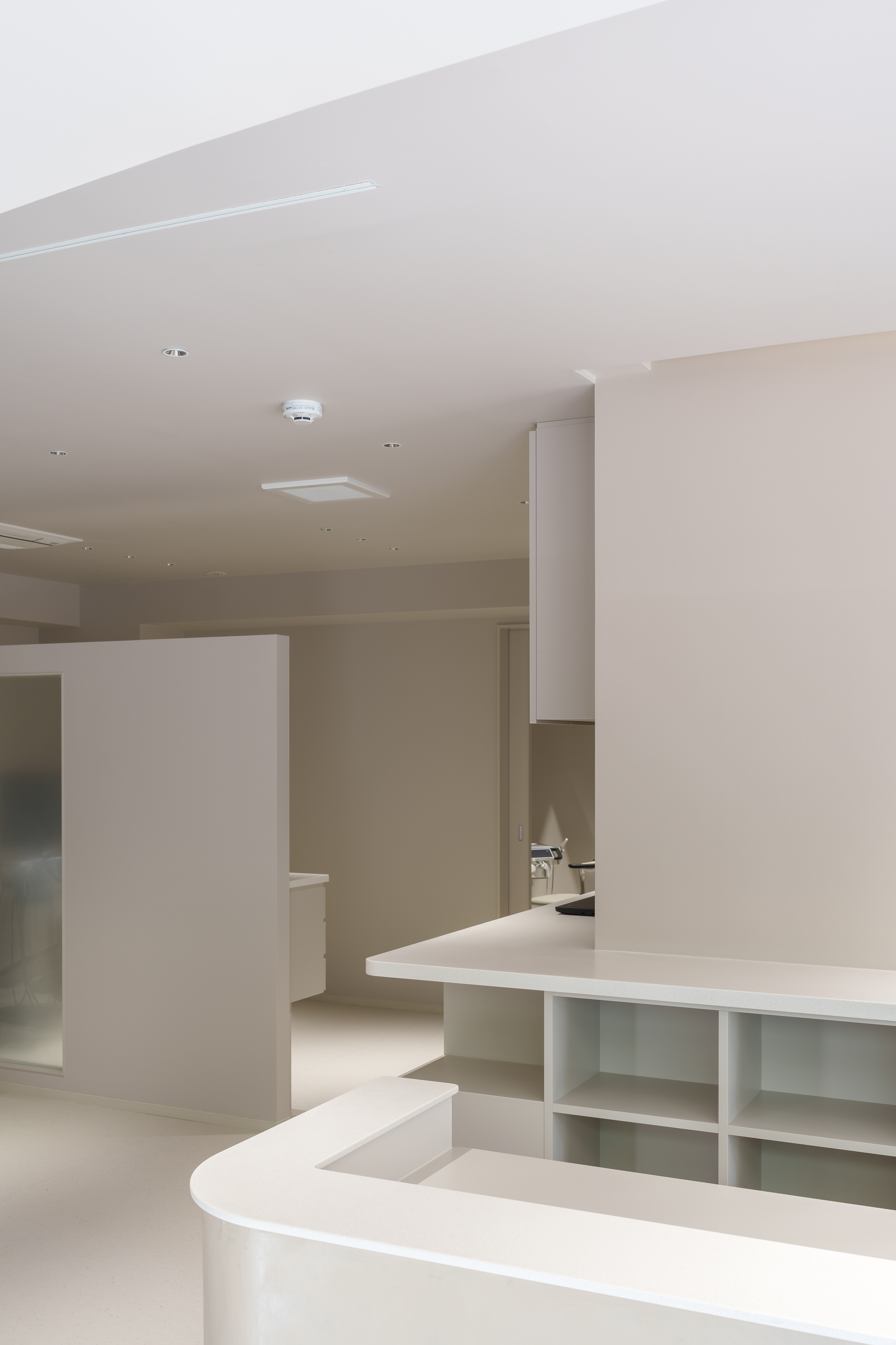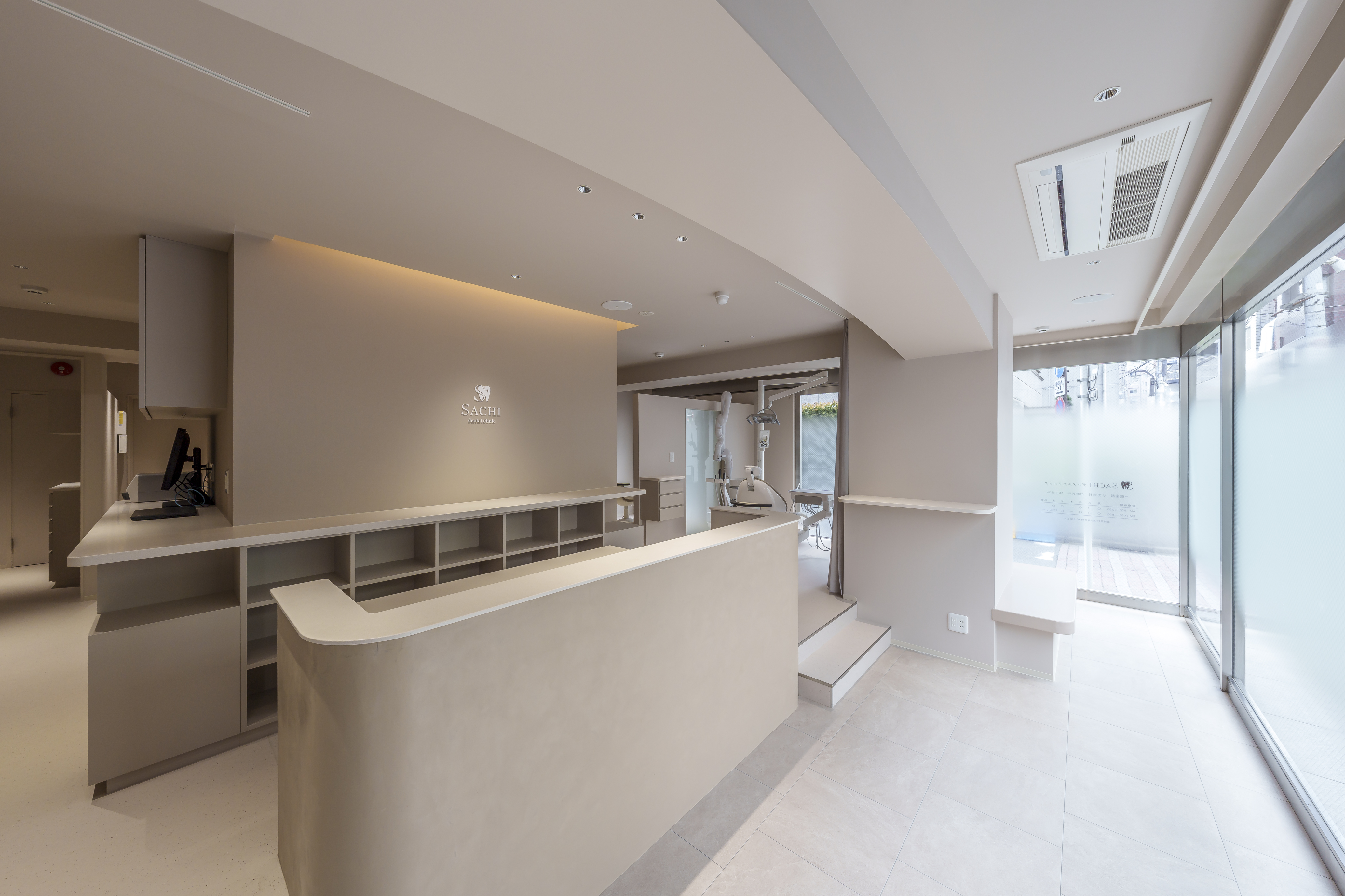 ご依頼をうけ、建築空間は可能な限りラインの少ない形状、採用色を限定することでノイズレスでスッキリとさせた空間を実現。ノイズレスな空間は清潔感、安心感がある背景になり、その中で生まれる治療、会話を主役となれるようデザインしている。