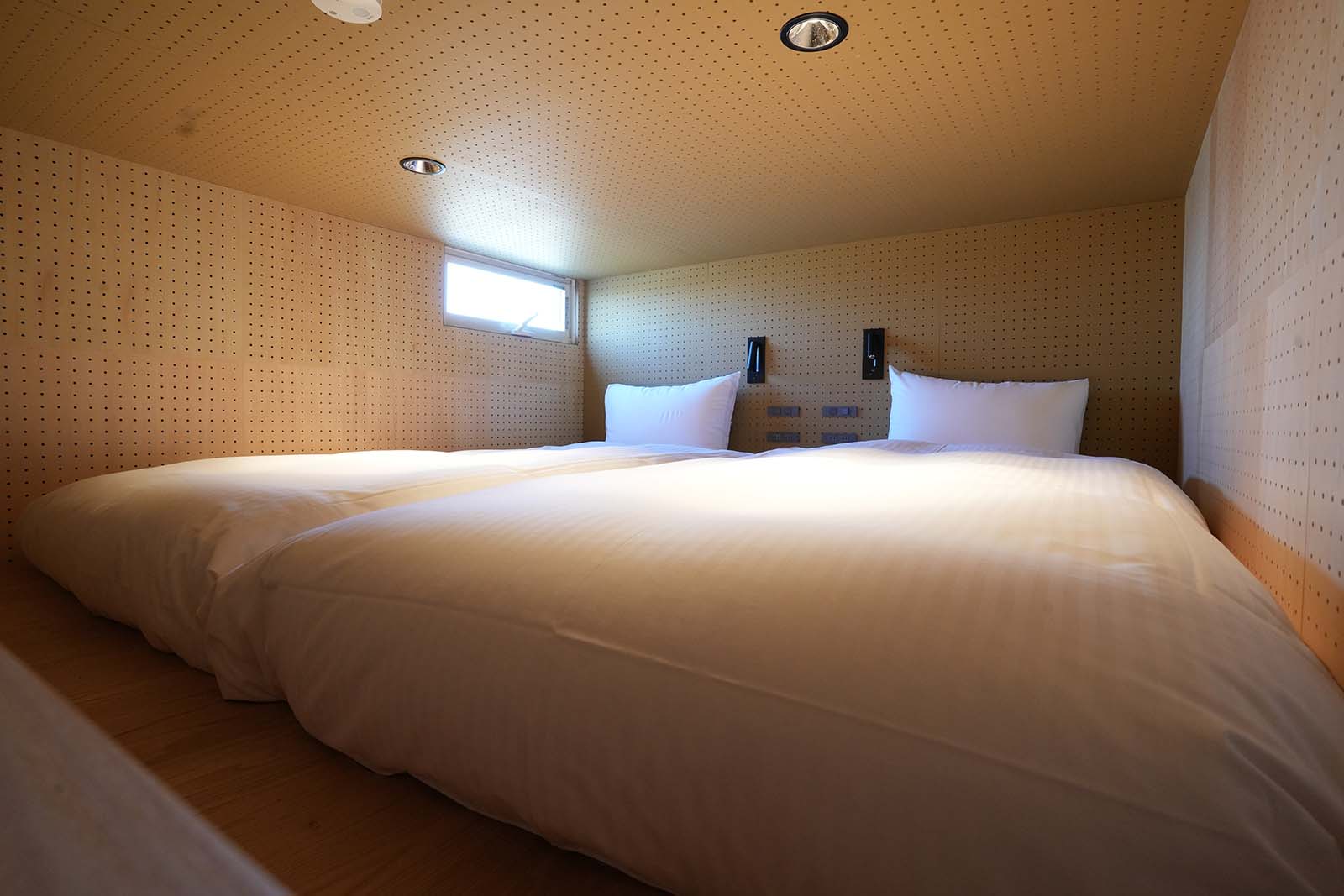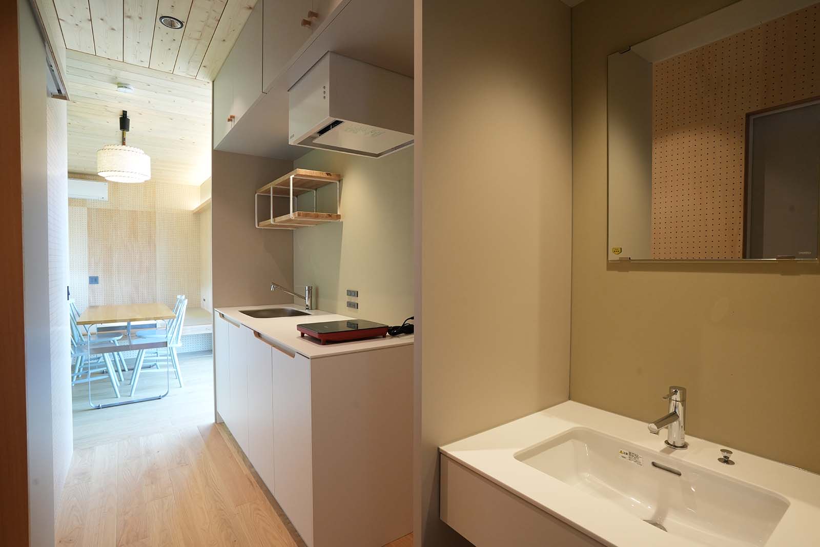 2台のトレーラーには最大8名の宿泊が可能。広々としたスペースはインバウンドから男女に分かれての企業合宿も想定した、幅広い宿泊が可能。長期滞在を想定してキッチン等の調理設備も充実させた
