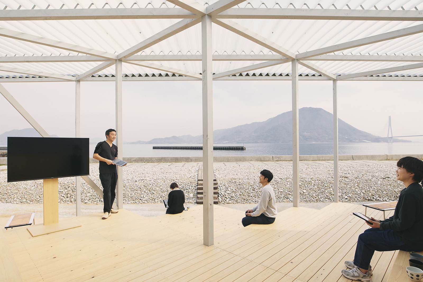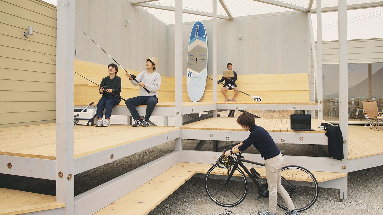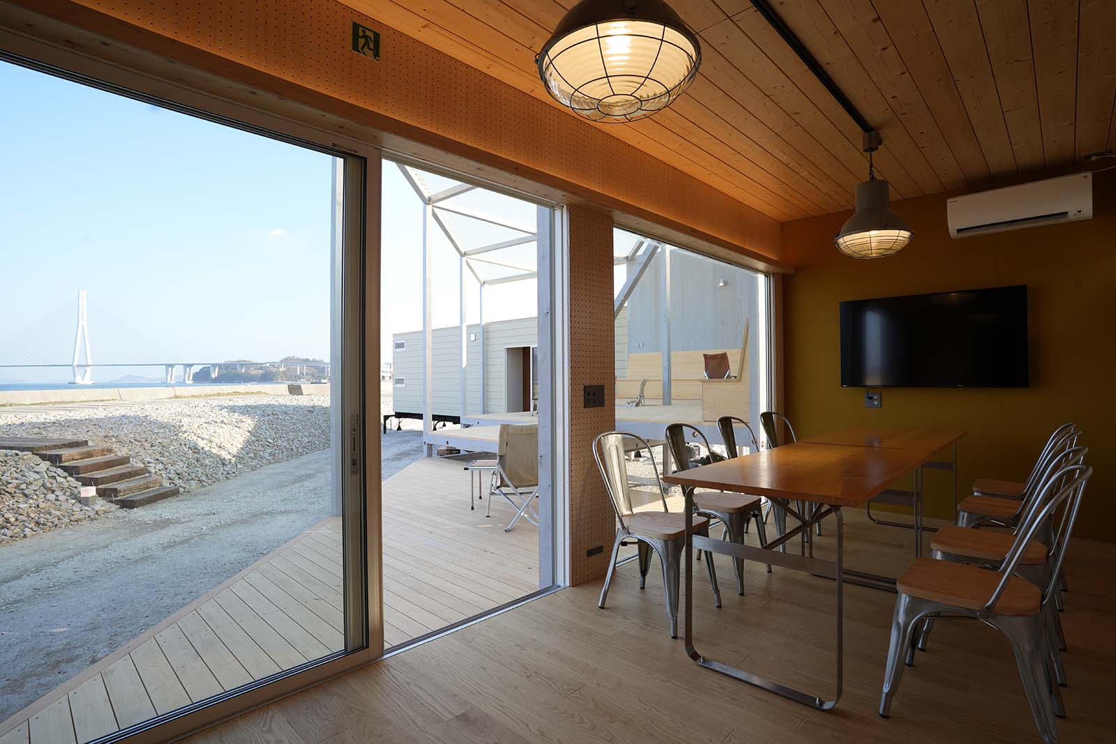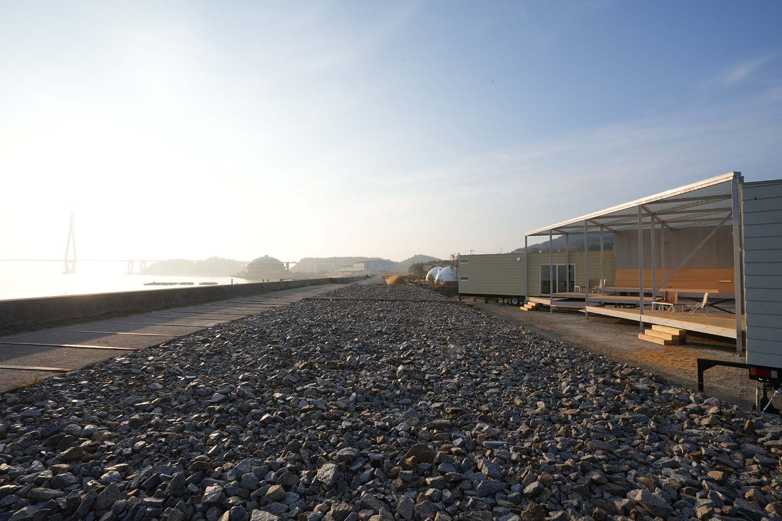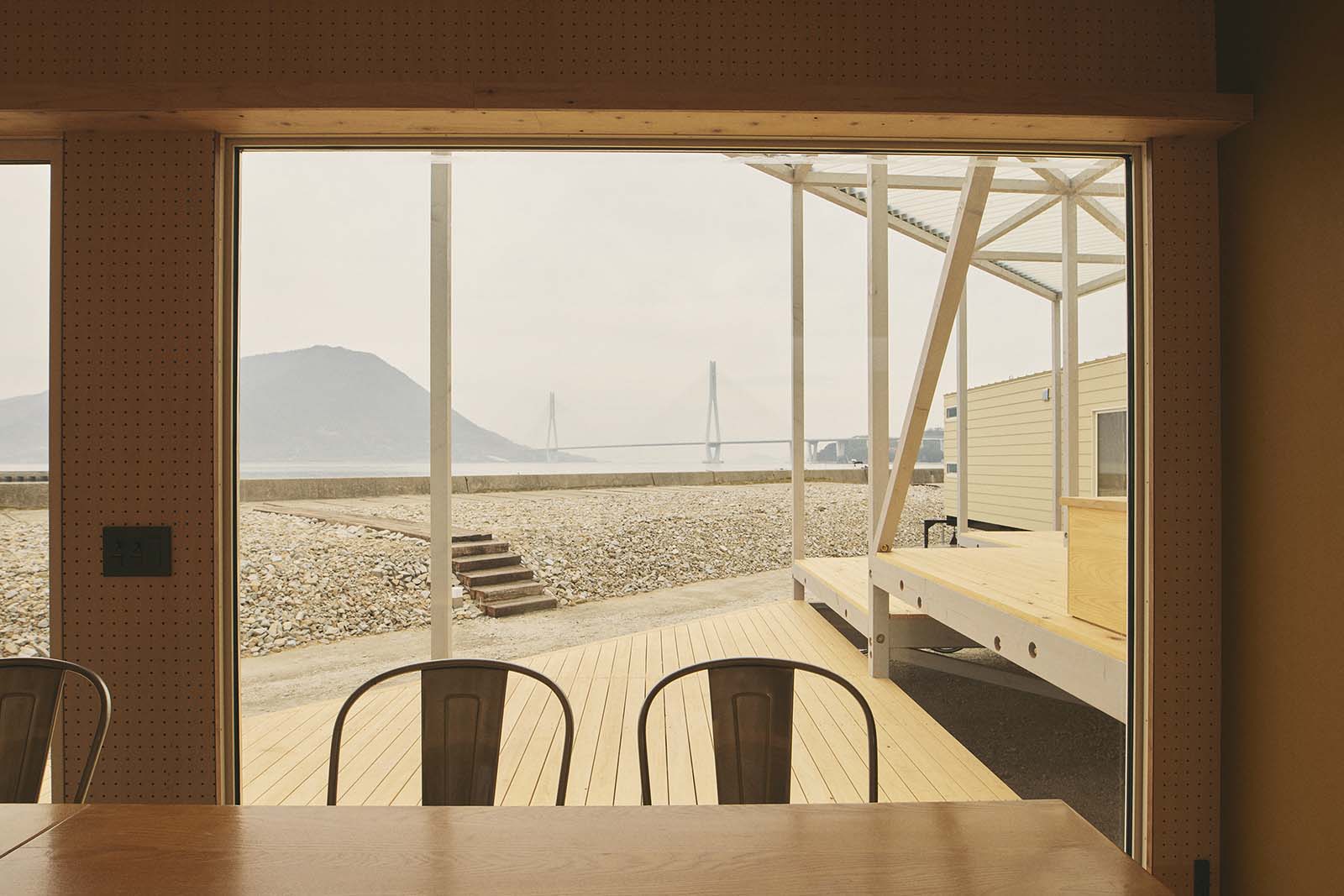 島にかかる多々羅大橋の眺めを斜向かいに位置するよう、2台のトレーラーを海に開けたプライベートビューを確保する配置とした。三角形平面の階段状デッキは、どこにいてもプライベート感があり、風景を感じながら過ごせる屋根あり空間である。